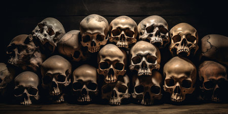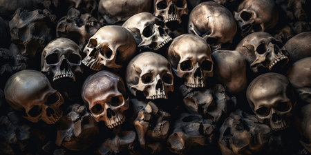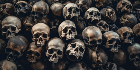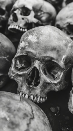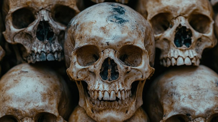 CloseUp of Weathered Skull Pile in Dark, Eerie Setting for Gothic Themes.