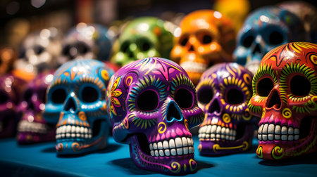 A colorful display of sugar skulls next to one another. Generated by artificial intelligence.