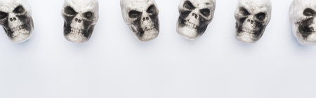 A collection of multi-colored skulls laid out in a line. Halloween concept.