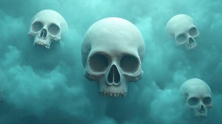 This captivating image features ethereal skulls gracefully floating amidst soft clouds, creating a mysterious atmosphere that evokes thoughts of mortality and beauty.