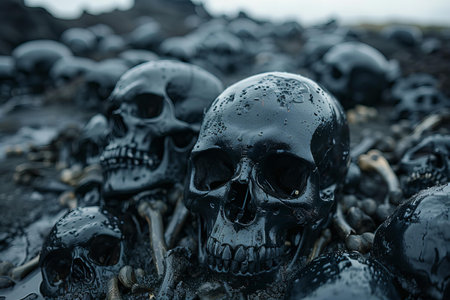 Dark and eerie skulls are piled together, creating a captivating and chilling scene.