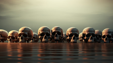 Skulls arranged in a dimly lit area reveal a somber and artistic ambiance.