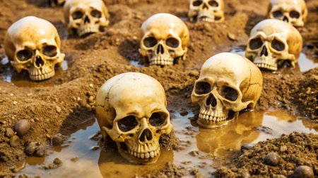 Realistic depiction of skulls partially buried in wet soil, ideal for horror-themed projects.