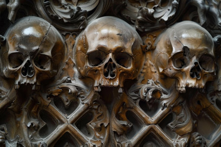 Intricate skull sculptures arranged closely together, showcasing artistry and detail.