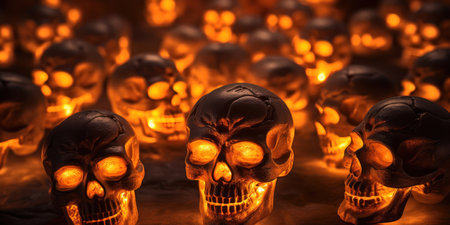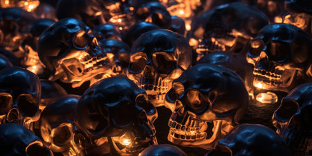 Glowing pile of spooky skulls emitting an eerie light. Creepy collection of illuminated skulls for Halloween. AI Generative