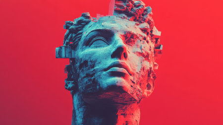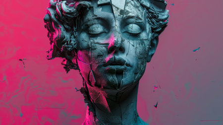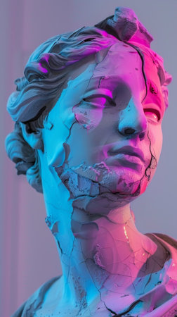 Digital Art of Cracked Classical Statue with Neon Pink and Blue Lighting