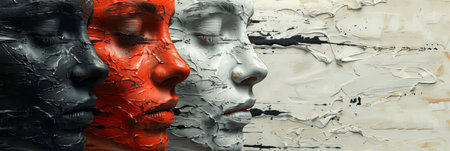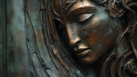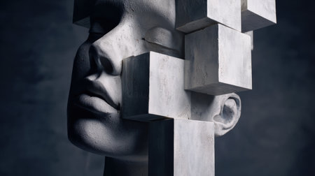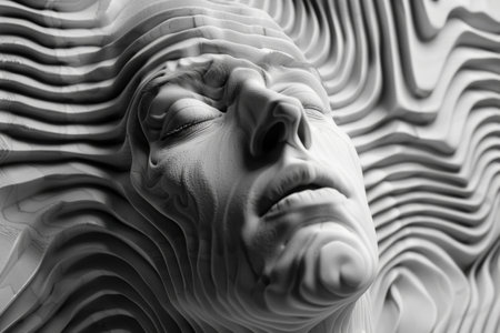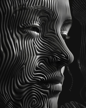 A dramatic sculpture of a face in focus, surrounded by artistic shadows and light for a striking visual effect.