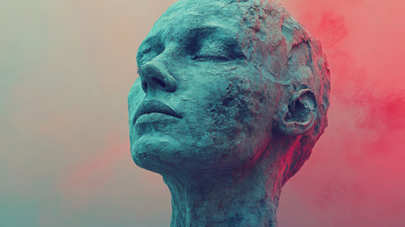 Modern creative concept background with ancient statue head. Collage with sculpture of human face in surreal style. Contemporary art poster. Funky vibrant texture. Wallpaper mockup template design.