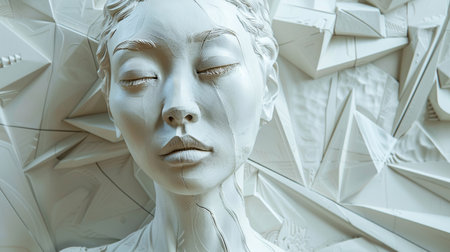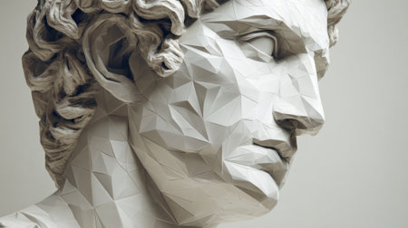 A highly detailed sculpture captures a unique geometric design and lifelike expression. Set in a minimal gallery, the artwork highlights the beauty of classical features and craftsmanship.