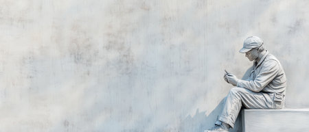 A skilled sculptor has crafted a realistic statue of a man casually sitting on a block and using a mobile device against a plain wall.