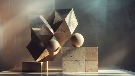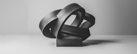 A minimalist sculpture of intertwined rings and cubes in monochrome, creating a sense of balance
