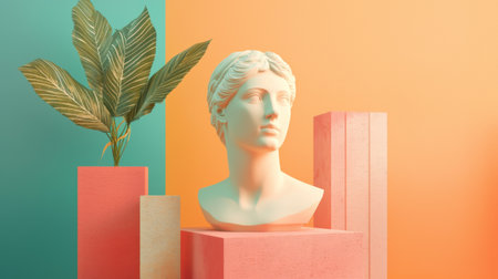 A classical bust statue paired with modern pastel-colored geometric decor, creating a juxtaposition of styles.