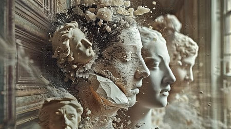 Classical Sculpture Exploding, Dust And Fragments, Symbolizing The Fragility Of Time And Beauty.