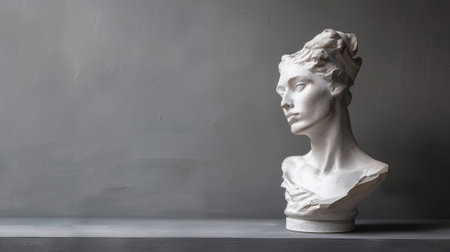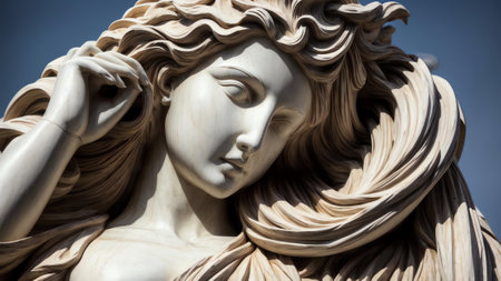 Capture the essence of classical art with this close-up of a marble bust featuring detailed hair and a graduation cap. Perfect for themes of education and culture.