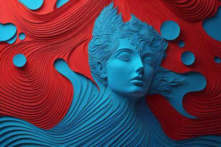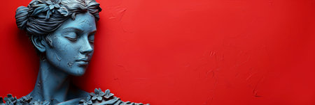 Blue classical bust sculpture against red background for art, history, or cultural themes. With Generative AI technology.
