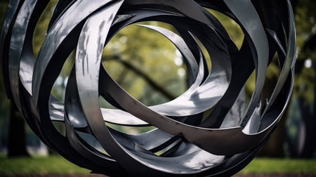 Curved bronze sculpture exhibits intricate forms and textures, reflecting natural light beautifully outdoors.