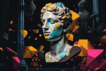 Plaster head and bust of ancient statue amid contemporary art collage on dark fluid geometric backgr