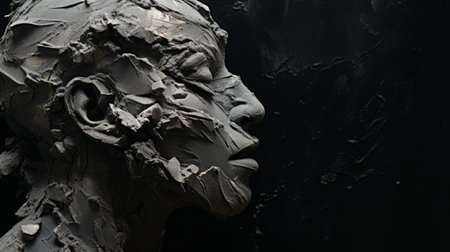 clay man head sculpture by julio sguera, featuring a dark and dramatic chiaroscuro style. this rough-edged 2d animation piece, titled tami bone, showcases the artist's skillful use of the impasto technique. the close-up shot highlights the fragmented figuration and effectively captures the trapped emotions depicted in the sculpture. ai generated
