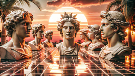 Abstract greek god sculpture in retrowave city pop design, vaporwave style colors, 3d rendering