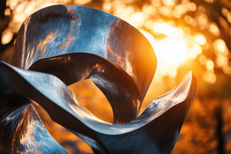 Sculptural artwork catches sunset reflections, surrounded by autumn foliage creating a serene atmosphere.