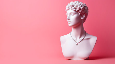 A classical marble bust illuminated with modern lighting against a vivid pink background, blending tradition with contemporary aesthetics.