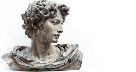 A white bust of a man with curly hair on a dark background. Created with Generative AI technology