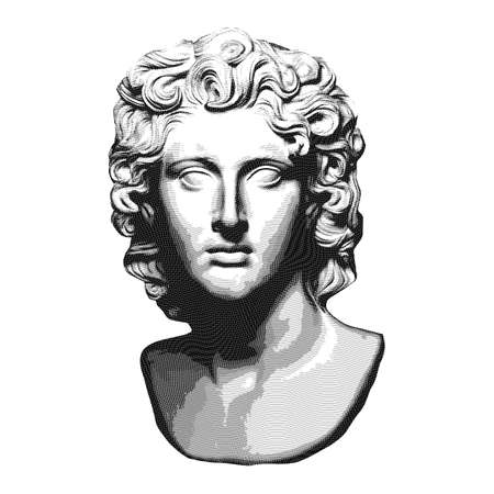 Gypsum copy of ancient statue Apollo head isolated on black background. Plaster sculpture man face.