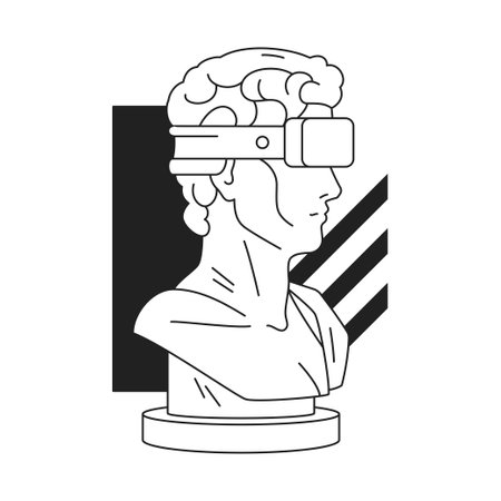 Y2k surreal Greek bust god in VR goggles futuristic contemporary pop art icon vector flat illustration. Psychedelic antique male statue monument virtual reality science fiction outline artwork