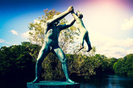 Norway, Oslo, Frogner Park, Gustav Vigeland Sculpture Park, June 12th, 2016 - Sculpture of a man holding a child