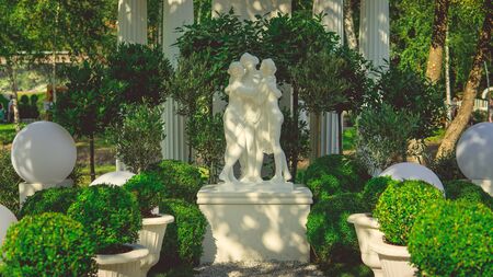 A beautiful white sculpture on the background of green trees in the park