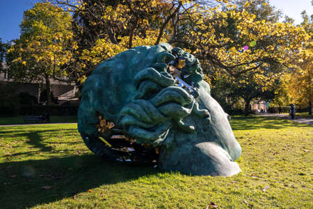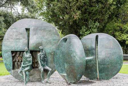 Auckland, New Zealand - March 1, 2017: Greenish bronze Karangahape Rocks statue by Greer Twiss at Symonds Street Cemetery in front of green trees. Three large circular pieces and the image of two men