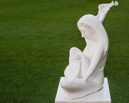 A white vintage little girl ceramic sculpture in the garden, selective focus.