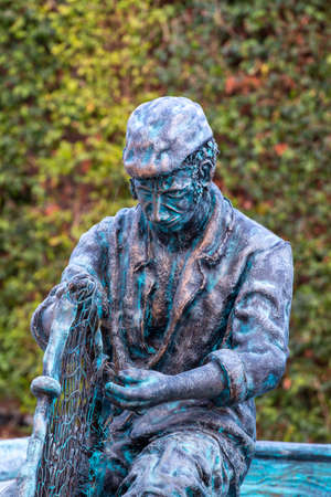 Close up view of a bronze fisherman statue, located in Olhao city, Portugal.