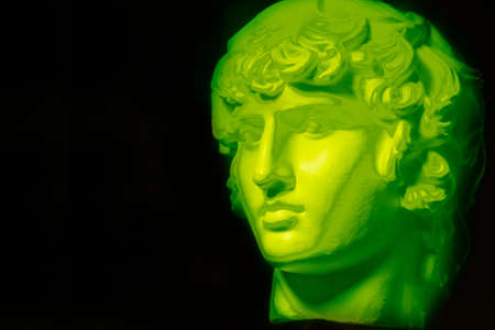 Gypsum copy of ancient statue Hermes head in orange green neon light. Neon image with ancient greek sculpture Hermes head. Minimal art fantasy concept. Copy space