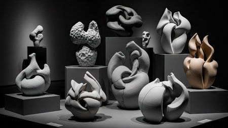A collection of abstract sculptures are presented on pedestals, each with unique forms and textures. The monochrome color palette, contrasted by deep shadows, highlights the sculptural details. This arrangement suggests an indoor gallery setting, ideal for artistic, design-related, or editorial applications. The lighting enhances the forms for various commercial uses.
