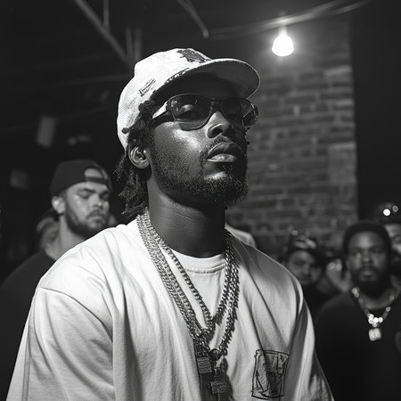 A monochromatic close-up photograph capturing a stylish man in casual attire amid a group setting.