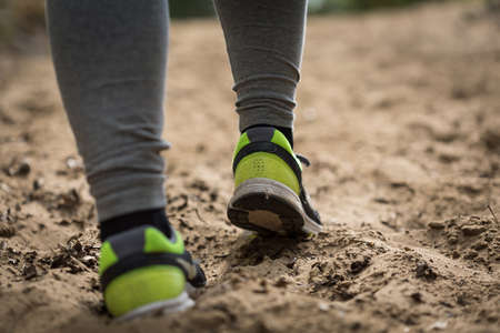 Close up of female feet run through off-road. Cross country running. Healthy lifestyle concept. Active sports people