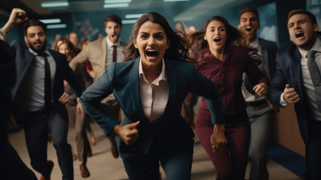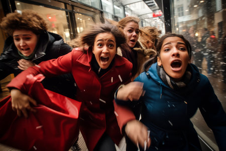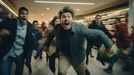 Frenzy Black Friday shoppers running inside shopping mall, crowd of people while shopping during seasonal sales. Diverse people customers rushing for bargains, hunting for discounts, doorbuster
