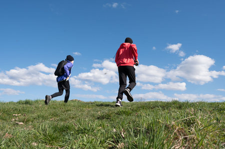 Active boys enjoying a run on a grassy hill. The bright blue sky and fluffy clouds create a cheerful, energetic atmosphere. A perfect day for outdoor fun.