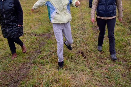 Healthy adults hiking in wet forest, splashing through muddy footpaths generated by artificial intelligence