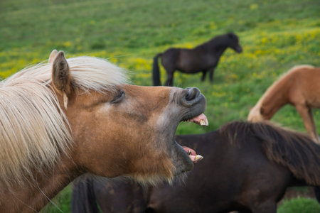 A dynamic scene of wild horses galloping through a dusty environment under a clear blue sky. The energy and freedom of these majestic animals create a vibrant image of nature and adventure.