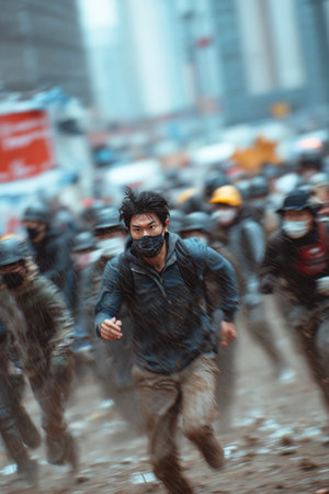 Protesters sprint away from police in a chaotic urban environment showcasing the tension between citizens and law enforcement during a large demonstration.