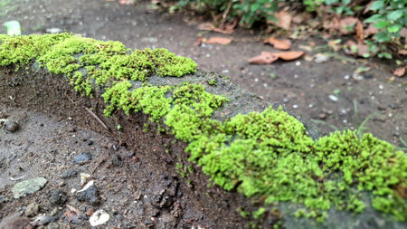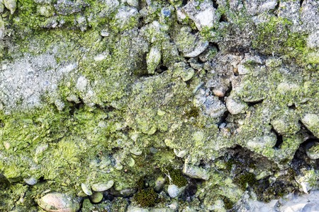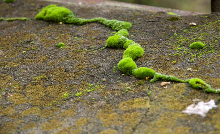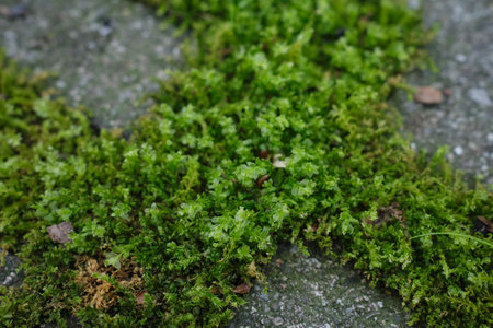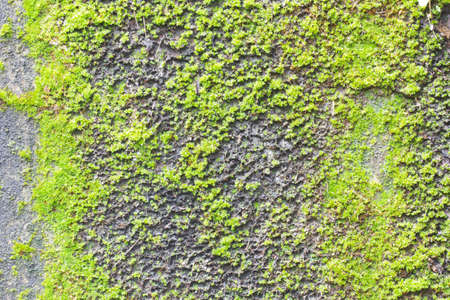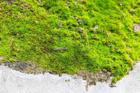 Insect living in fresh green moss growing on old cement wall, nature concept background, outdoor day light