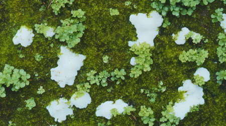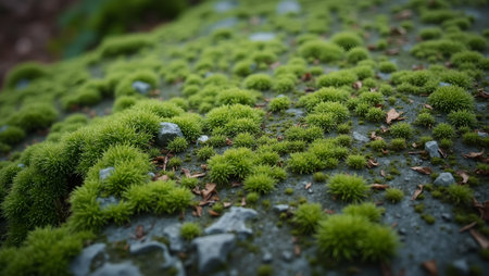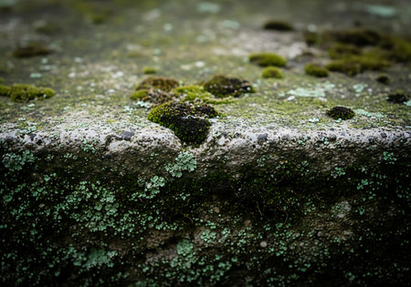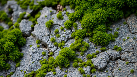 Detailed view of vibrant green moss and grey lichen clinging to a rough, weathered surface, showcasing natural textures.