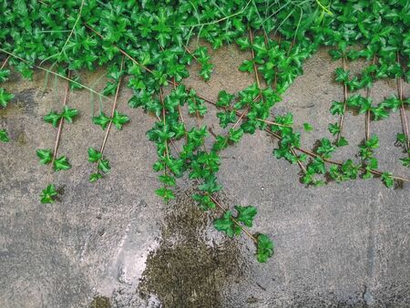 Ivy Gourd on cracked gray concrete wall. Vine green nature background with copy space for text