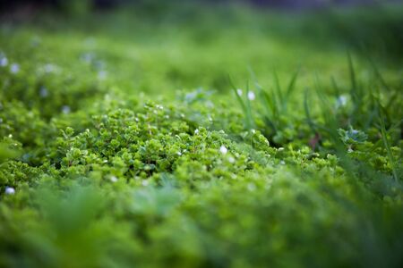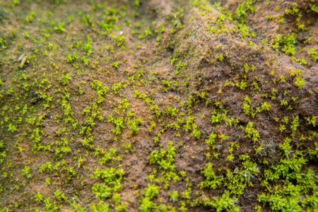 Green moss in the spring forest. Selective focus macro shot with shallow DOF.