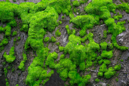 Beautiful Bright Green moss grown up cover the rough stones and on the floor in the forest. Show with macro view. Rocks full of the moss texture in nature for wallpaper.