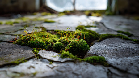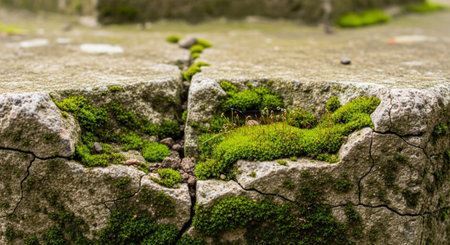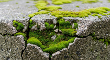 Close up of vibrant green moss and tiny plants growing between concrete pavement cracks on a sunny urban street.