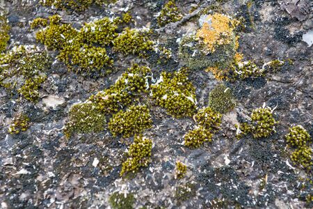 Green moss grows on stones. Wild nature. Moss on the stones close-up. The texture of the stone. The texture of the moss. Moss on a colored large stone.