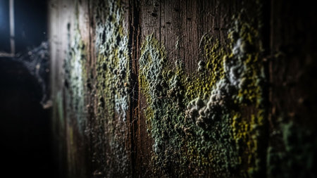 A detailed close-up view of mold and mildew colonies growing on weathered wooden planks. The organic growth presents a textured surface with irregular shapes and a color palette of greens, yellows, whites, and grays against the dark, aged wood. The evokes a sense of decay and neglect, highlighting the intricate details of biological decomposition.